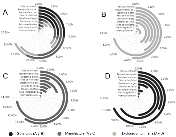 El sector de servicios (Gráfica 13-B) se enfrenta a desafíos únicos, con la ciberseguridad (3,1% del total general), la gestión y calidad de los datos (2,8%) y los requerimientos de alta inversión (5,2%) como los principales obstáculos. En un sector que es naturalmente más digital, los problemas de ciberseguridad y gestión de datos son de particular relevancia. Las PYMES en el sector de manufactura (Gráfica 13-C) enfrentan principalmente requerimientos de alta inversión (13,6%) y la falta de infraestructura (11,2%). Estos desafíos indican que las PYMES manufactureras pueden tener dificultades para reunir los recursos financieros y físicos necesarios para la implementación de las tecnologías de la Industria 4.0. La inversión en infraestructura puede ser especialmente crítica debido a la naturaleza física de las operaciones de manufactura. En el ámbito de la explotación primaria (Gráfica 13-D), las PYMES experimentan dificultades significativas para incorporar tecnologías de la Industria 4.0. Entre estos desafíos, la falta de infraestructura (10,1%) y la resistencia al cambio por parte de las personas en la empresa (9,8%) destacan como los más relevantes. Además, la falta de habilidades en la fuerza de trabajo es un problema considerable (7,3%). Estos desafíos sugieren la necesidad de un enfoque integral que incluya la inversión en infraestructura, la formación de los empleados y una adecuada gestión del cambio.
