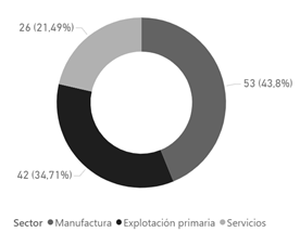 El sector de la manufactura es el más grande con un 43,8% de participación de las empresas encuestadas. Dentro de la manufactura, el mayor porcentaje lo representa la fabricación de aparatos y equipos electrónicos con un 19,83%, seguida de productos textiles con un 10,74% y productos de madera con un 4,13%. El segundo sector más grande es la explotación primaria, que comprende el 34,71% del total de empresas encuestadas. El mayor porcentaje dentro de este sector es de empresas dedicadas a la producción agrícola, que representan el 23,14% del total. Las empresas mineras y de energía comprenden el 7,44% del total. Por otro lado, el sector de servicios representa el 21,49% del total de empresas. Las empresas de servicios con mayor proporción son las de servicios generales con un 8,26%, seguidas por las empresas de servicios de construcción, con un 5,79%. Los servicios financieros, educativos y de transporte representan un porcentaje menor de las empresas de servicios, con un 2,48%, 0,83% y 0,83% de participación respectivamente.
