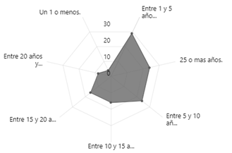 En la Gráfica 2 se puede observar que la mayoría de las PYMES tienen menos de 15 años en el mercado. En particular, un 24% de las empresas tienen entre 1 y 5 años de antigüedad, mientras que un 13,2% tienen entre 10 y 15 años y otro 13,22% tienen entre 15 y 20 años. Esto indica que existe una gran cantidad de empresas nuevas en el mercado, mientras que las empresas más antiguas son menos comunes.