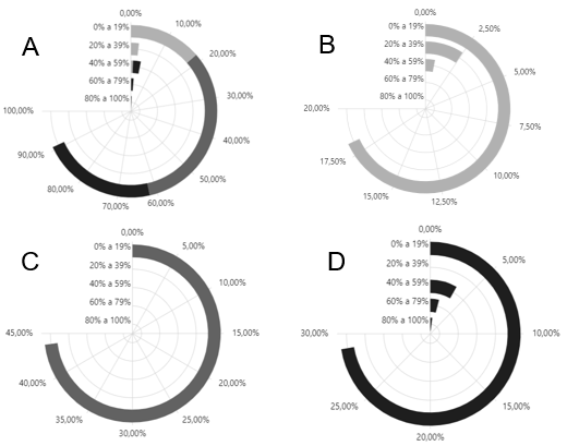 En la Gráfica 7 se evidencia que exististe una baja implementación de mecanismos para la impresión 3D en los tres sectores de estudio (90.91% de las PYMES de estudio manifiestan haber implementado entre 0 a19% de sus procesos algún mecanismo de impresión 3D. El sector manufactura (Gráfica 7-C) es el de menor implementación de este tipo de tecnologías, todas las empresas encuestadas de este sector (43.80% del total general) utilizan la impresión 3D en un rango de 0% a 19% de sus procesos.