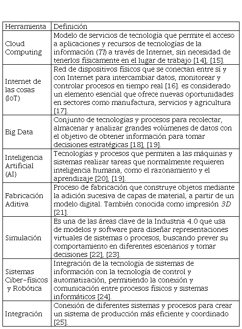 La Industria 4.0 facilita la toma de decisiones fundamentada en datos y en tiempo real [10]. Tiene como pilares la digitalización, la flexibilidad y personalización de la producción, la logística, la simulación y la eficiencia energética y de materias primas [13]. Para desarrollar los pilares, se utiliza comúnmente nueve herramientas asociadas a la industria 4.0: Cloud Computing, Internet de las cosas (IoT), BigData, Inteligencia Artificial (IA), Fabricación Aditiva, Simulación, Sistemas Ciber-físicos y Robótica y la Integración [13]. Estas herramientas se definen a continuación: