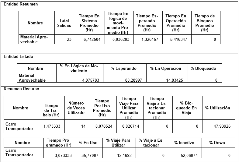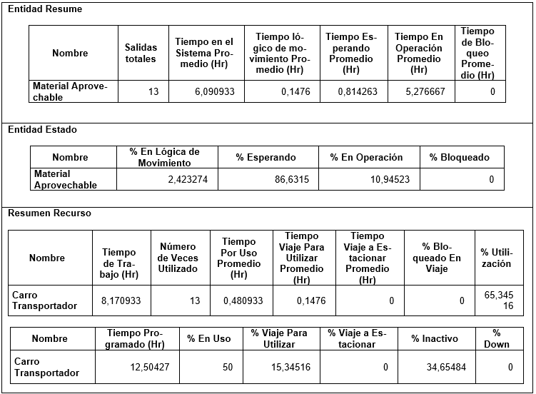 Resumen recurso (recurso se refiere al vehículo transportador): el porcentaje de utilización pasa del 65% de la alternativa 1 al 47,94%. Y del 50% del tiempo en uso de llenado de la alternativa 1 al 35,77%, con solo actividades de selección.