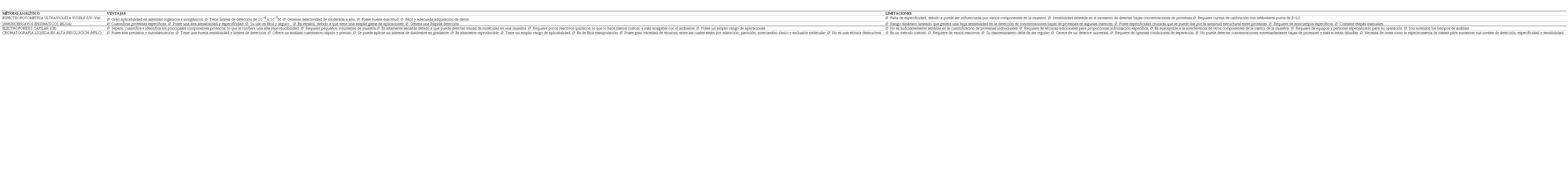 La HPLC en fase reversa es la técnica más utilizada para la separación y cuantificación de las principales proteínas de la leche (caseínas) y el lactosuero (β-lactoglobulina), incluida la identificación de sus variantes genéticas debido a que es un método fiable y rápido [53]. Inicialmente se propuso un método que permitió separar y cuantificar proteínas a una longitud de onda de 214 nm, empleando una columna C18[54]. Mas recientemente, otros estudios se basaron en HPLC para mejorar el método en cuanto a la disminución de costos, tiempo de análisis y optimización en la separación de proteínas utilizando columnas C8 [15], [55], [56], [57], [58]. En los últimos años, la HPLC ha alcanzado su límite teórico, por lo cual se ha acoplado a la espectrometría de masas (LC-MS/MS), instrumento que le proporciona una mayor resolución en el proceso de identificación de proteínas y sus modificaciones [59]. Por lo anterior, esta técnica requiere de óptimas condiciones de separación como las fase móvil y estacionaria, el tipo de elución, la columna, la temperatura, la presión, los parámetros de detección, la curva de calibración, así mismo, pueden interferir los componentes de la matriz. A pesar de que tiene una buena sensibilidad y límites de detección, no puede detectar concentraciones extremadamente bajas de proteínas y más si estas están diluidas. Por lo tanto, esta técnica requiere de otras como la espectrometría de masas para aumentar sus niveles de detección, especificidad y sensibilidad en los diferentes análisis que impliquen cuantificar proteínas. A continuación, se presenta la Tabla I, la cual proporciona una descripción concisa y relevante respecto a las ventajas y limitaciones de los diferentes métodos analíticos empleados para la cuantificación de la proteína β-LG.