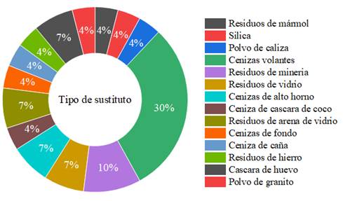 Diferentes residuos como cenizas volantes [15], [16], escoria triturada de alto horno [17], escoria de acero [18], metacaolín [19], polvo de vidrio [20], [21], y cenizas preparadas a partir de cascarilla de arroz [22], [23], cascara de huevo [24], [25], [26], bagazo de caña [27], [28], [29] cascara de palma de aceite [30], [31], [32], entre otros, han sido utilizados como materiales cementantes sustitutos del aglutinante en la producción de hormigones.