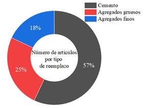 Tal como se puede apreciar en laFigura 3 alrededor del 57% de los artículos incluidos en esta revisión, reportaron el CO2 que se emite en hormigones modificados con reemplazo del cemento, mientras que solo el 18% se enfocaron en el reemplazo de la grava y 25% en el reemplazo de la arena. Asimismo, se encontró que del total de artículos reportados en la tabla 2, gran parte de ellos, alrededor del 47%, informan la preparación de hormigones con residuos inorgánicos, principalmente cenizas volantes y escorias de alto horno. Esta tendencia está asociada a una mejora sustancial de las propiedades mecánicas del hormigón modificado, así como a un mayor porcentaje de reducción de CO2.