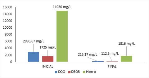 A pesar de que el Hierro presento un 87,83% de remoción, no cumple con lo exigidos por la legislación colombiana a través de la Resolución 0631 de 2015 para aguas residuales no domésticas generadas por las actividades enfocadas en hidrocarburos.
