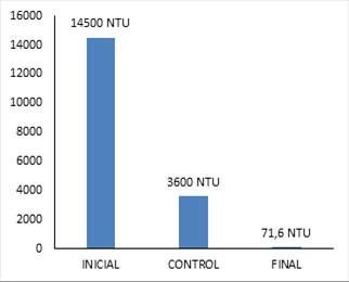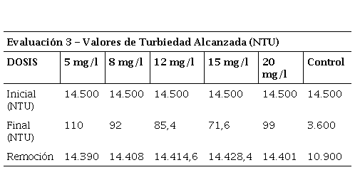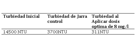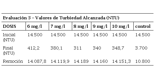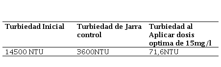 En las Tabla 3 y 4 se observa el comportamiento de la turbidez a medida que se le aplicaban las diferentes dosis del coagulante