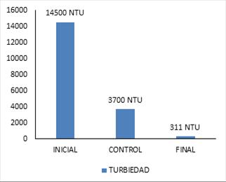 Cabe resaltar, que se pudo analizar primera vista un alto valor de remoción con respecto a la turbiedad mostrado mayor porcentaje de eficiencia comparación con [8], donde se afirma y estudia que el porcentaje de remoción en cuanto turbiedad con almidón de yuca es de 68,5%.