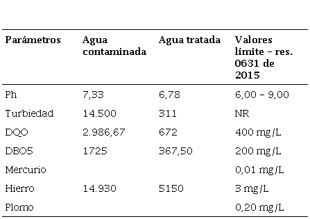 En términos generales se puede observar que los parámetros pH, DQO, DBO, Hierro, Cobre, Cromo, Níquel, Arsénico y Mercurio no cumplen con los límites máximos permisibles según la legislación colombiana Resolución 0631 de 2015, por lo que se evidencia que las aguas provenientes de la actividad extractiva presentan una enorme concentración de contaminantes como se observa en la caracterización inicial realizada. Gracias a los resultados obtenidos se escogieron tres metales (Plomo, Mercurio, Hierro) con el fin de evaluar el porcentaje de remoción de estos a través de la aplicación de solución de coagulantes naturales.