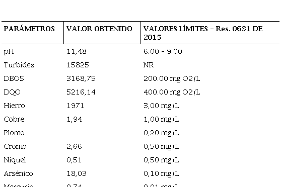 Los resultados obtenidos luego de analizar el efluente de agua residual proveniente de pozos de perforación de petróleo y gas se presentan en la siguiente tabla