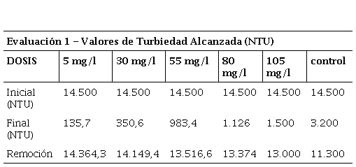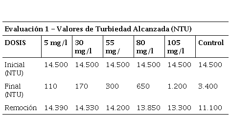 En ese sentido, [4] obtuvieron buenos resultados en su proceso de tratamientos de aguas al aplicar una concentración de solución al 1%. La dosis óptima para la remoción de turbiedad y color respecto al coagulante fue de 5 mg/L.