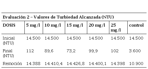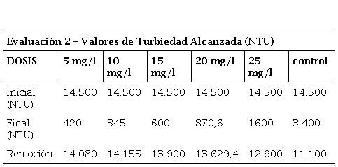 A continuación, se presenta la tabla 2 con los valores de turbiedad hallados en la primera corrida.