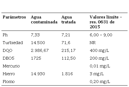 La reducción porcentual de la turbiedad fue de 97,85%, DQO 77,5%, DBO5 78,7%, Hierro 65%,639.