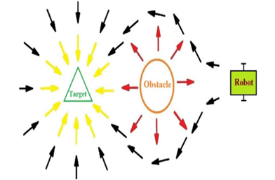 In 1986, Khatib [38] introduced the APF technique for navigating cellular robots. He argues that the chasing targets and challenges characteristic of charged surfaces, and their total available energy, exert an illusory appeal on robots. As seen in Figure 8, this hypothetical pressure pulls the robot towards the target and keeps it avoiding barriers.
