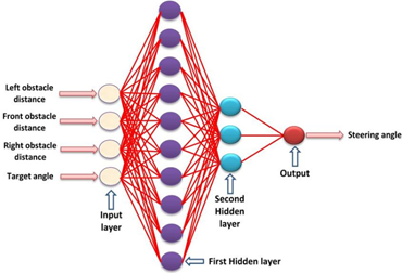 An artificial neural network (ANN) is an intelligent system composed of many small, tightly coupled processing components. These aspects convey information due to their ability to respond dynamically to environmental stimuli. Essentially, NNs are represented by ordered layers of related nodes. Nodes have an activation function. The pattern evidenced below can be recognized from the input layer of the NN mechanism [21]. These patterns are then combined with the embedded layer for the actual processing using weighted interconnection devices. The output layer communicates with the hidden layer to provide the required response. NN properties such as generalization, massively parallelism, distributed representation, learning ability, and fault tolerance can support mobile robot navigation. A NN for navigating a wheeled cellular robot in an unfamiliar environment. He used his two NN-based strategies to create collision-free paths. While the first neural mechanism uses sensory facts to discover unoccupied spaces, the second neural community (NN) computes safe paths by avoiding the nearest obstacles. To keep away from the human direction, Qiao et al. We advocate an independent acquisition of the navigation system [22]. Without human intervention, the NN adapts to the complexity of the environment by inserting and removing new hidden layers at specific training points to perform navigation tasks. Fast Simultaneous Localization and Mapping (Fast SLAM) is a method developed by Li et al. An approach that uses NNs to prevent the accumulation of errors is introduced using bad odometry mannequins and bad linearization of nonlinear SLAM functions. Using NN and Fast SLAM improves the ability of cellular robots to constantly navigate new areas while avoiding collisions with objects. The robot's navigation manoeuvres should obtain satisfactory possible sequences. Many techniques have been integrated into NNs as hybrid mechanisms. Young-gyun et al. Describe a mixed NN and APF effort to achieve cooperative and competitive coordination for behavior-based control [21].