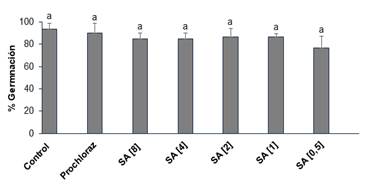 El crecimiento de raíces y la germinación de las semillas no se vieron afectados por la aplicación del formulado SA (Figuras 9 y 10). Las plántulas no presentaron una oxidación o clorosis en sus raíces, así como tampoco se observó daño en sus cotiledones, lo cual puede deberse a que los extractos no interfirieron en los procesos fisiológicos de la planta durante su desarrollo en las concentraciones evaluadas. En todos los casos, la germinación fue superior al 85% y no se encontraron diferencias estadísticas significativas. Los resultados indican que la actividad fitotóxica del bioformulado en el modelo empleado es baja, por lo que este puede ser utilizado a las concentraciones recomendadas (≤ 4 mL/L). En comparación con el tratamiento químico a base de tiabendazol, la formulación SA a 4 y 2 mL/L mostró afectar en menor medida el proceso de alargamiento radicular (Figura 10).