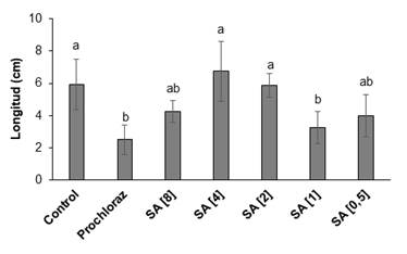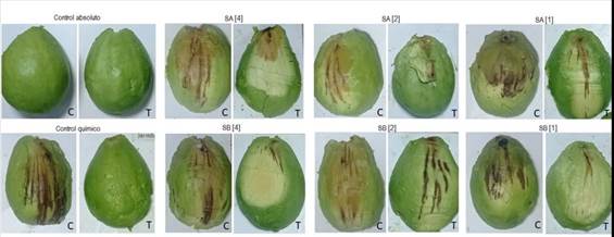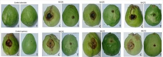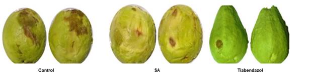 La reducción de la zona afectada en los frutos es evidente al aplicar SA y el tratamiento químico (Figura 8), lo que convierte a SA en una formulación con alto potencial para ser comercializado como producto biológico con capacidad fungicida o fungistática.