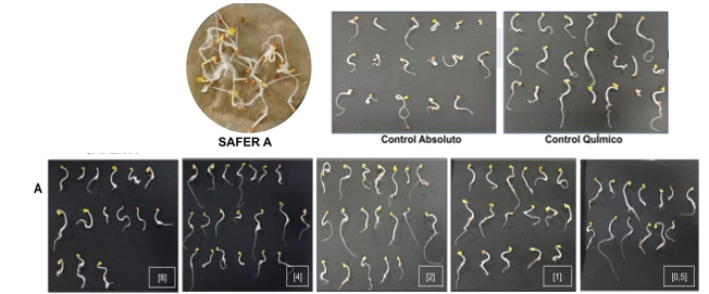 A Plántulas germinadas bajo la aplicación de Safergreen A a diferentes concentraciones.