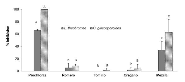 Letras minúsculas y mayúsculas indican diferencias (p˂0.05) entre tratamientos para L. theobromae y C. gloeosporioides, respectivamente.