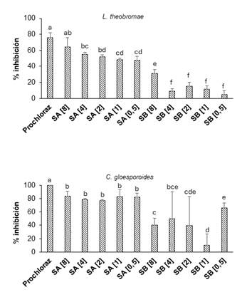 La capacidad de SA y SB para inhibir los fitopatógenos se evaluó a diferentes concentraciones con el fin de determinar una dosis adecuada para los experimentos in vivo (ver Figura 2). El tratamiento químico inhibió el desarrollo de L. theobromae y C. gloeosporioides en un 76 y 100%, respectivamente.La formulación SA obtuvo porcentajes de inhibición que oscilaron entre el 48 y 64% para L. theobromae y entre el 77 y el 84% para C. gloeosporioides. Por su parte, la formulación SB presentó porcentajes de inhibición que oscilaron entre el 5 y 31% para L. theobromae y entre el 11 y el 66% para C. gloeosporioides.
