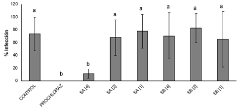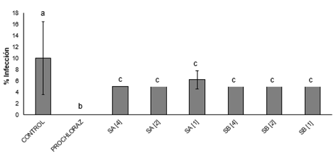 El tratamiento con prochloraz mostró ser el mejor para el control de ambos fitopatógenos, siendo más efectivo en el control de C. gloeosporioides (ver Figura 1). la formulación a base de la mezcla de los extractos mostró inhibir el crecimiento de L. theobromae y C. gloeosporioides en 34 y 63%, respectivamente; mientras que las formulaciones a base de una única planta aromática lograron inhibiciones por debajo del 10% en todos los casos. De ahí, dos bioformulaciones a base de la mezcla de extractos denominadas SA y SB fueron utilizadas en los experimentos posteriores.