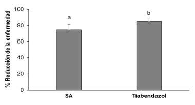 Tratamiento biológico (SA), tratamiento químico (Tiabendazol). Letras distintas indican diferencias estadísticas significativas entre tratamientos (p˂0.05).