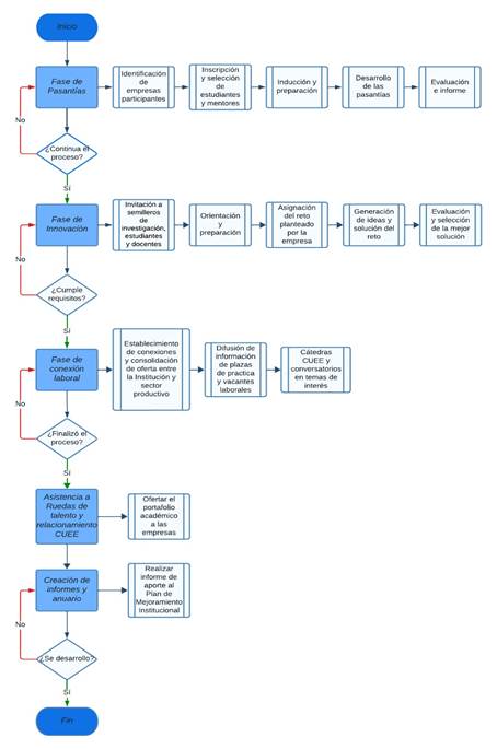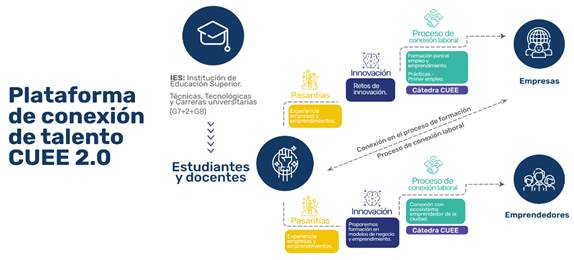 Este modelo “tiene como propósito contribuir al cierre de la brecha entre la oferta académica y la demanda del sector productivo” [19, párr. 2], “mejorar capacidades, minimizar la deserción académica y maximizar la empleabilidad, a través de la Plataforma de Conexión de Talento” [20, párr. 1], y está “dirigido a estudiantes de carreras técnicas, tecnológicas y profesionales de las instituciones de educación superior de la región” [19, párr. 2]. La Plataforma de Conexión de Talento CUEE 2.0 cuenta con tres fases: pasantías, innovación y proceso de conexión laboral (Figura 2) [21].