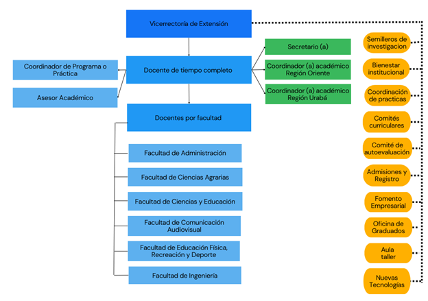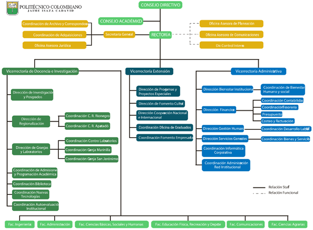 La estructura institucional (figura 3) está constituida por una jerarquía de puestos, roles y relaciones internas a nivel administrativo y académico, teniendo como máxima autoridad el Consejo Directivo, liderado por el gobernador de Antioquia, el rector y representantes de la Presidencia de la República, del Ministerio de Educación Nacional (MEN), del sector productivo, de los exrectores, de las directivas académicas, de los graduados, de los docentes, de los estudiantes [27][28]. Su principal función es asegurar que la institución opere de manera eficiente y eficaz, que cumpla con sus objetivos y mantenga altos estándares de calidad educativa, mediante la toma de decisiones en cuanto a políticas académicas, administrativas y de planeación institucional; el seguimiento a disposiciones legales y la definición de la organización académica, administrativa y financiera.