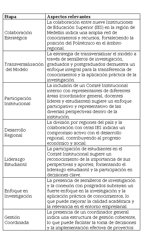 El análisis de aspectos relevantes para este estudio en las diferentes etapas del modelo propuesto por el CUEE para el contexto del PCJIC, se presenta en la tabla 1.