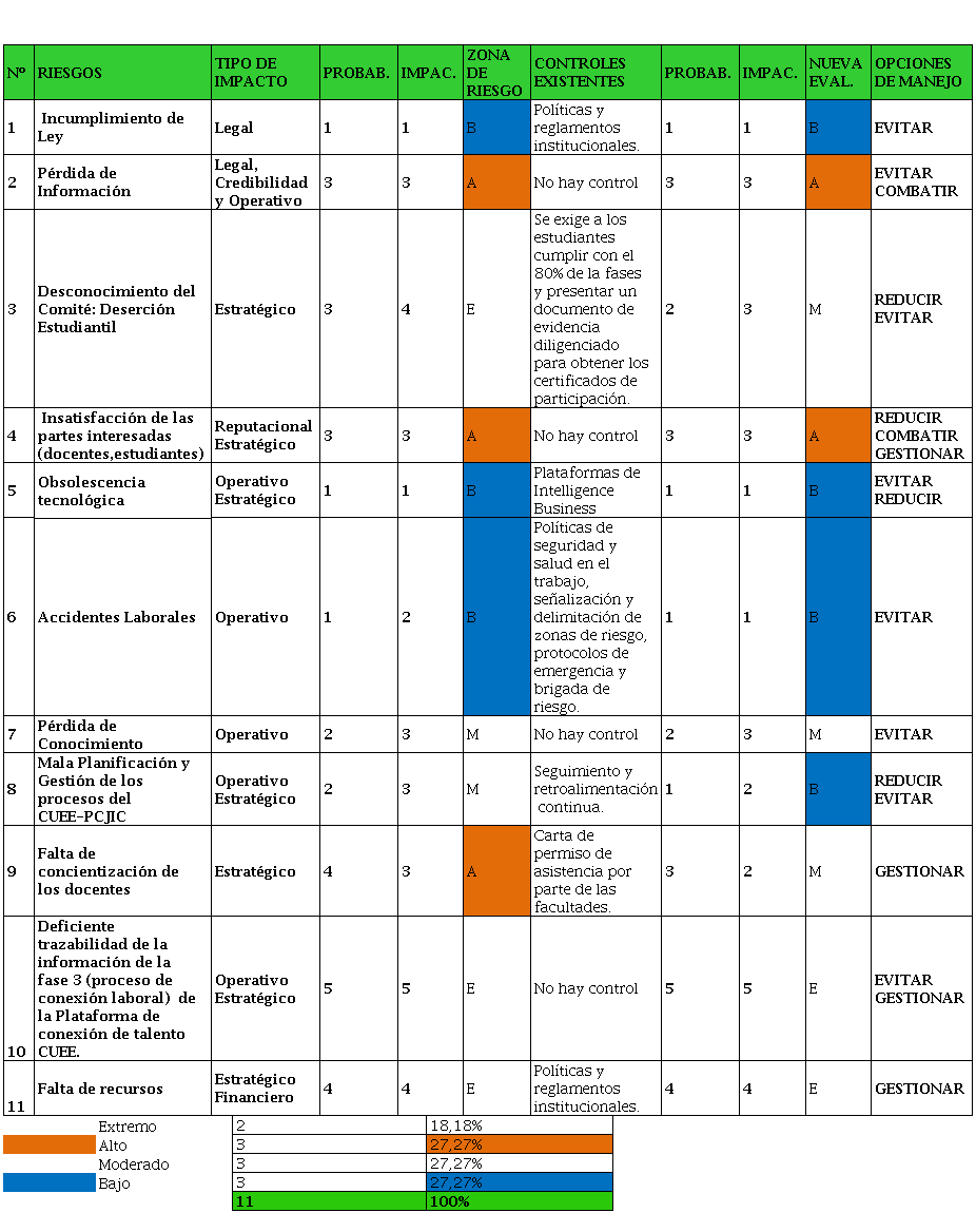 En cuanto, al desconocimiento del CUEE-PCJIC y la deserción estudiantil en la participación de las fases de pasantías e innovación se tiene un nivel moderado, por lo cual se debe tomar acción estableciendo estímulos de participación y sanciones a los participantes que desertan para mitigar el riesgo. Por otro lado, se encuentra la insatisfacción de las partes interesadas (docentes, estudiantes) con un nivel alto, debido a que las fases de la Plataforma de Conexión de Talento no cumplen las expectativas de los participantes, lo cual podría impactar en la reducción de futuros participantes de las actividades del CUEE-PCJIC, para combatir este riesgo se deben implementar mecanismos de retroalimentación y comunicación efectiva con los grupos de interés para abordar inquietudes y mejorar la calidad de la procesos. Finalmente se encuentra que la carencia de asignación presupuestal en el CUEE-PCJIC representa una amenaza significativa para la ejecución de sus funciones y la realización de proyectos conjuntos de CTI. Este riesgo se manifiesta cuando los recursos financieros no son asignados de manera adecuada para cubrir las necesidades operativas y estratégicas del CUEE-PCJIC, es un riesgo de nivel extremo, que amenaza la misión y objetivos del CUEE-PCJIC; por lo cual la implementación de controles financieros sólidos y estrategias de diversificación son fundamentales para mitigar este riesgo extremo y garantizar la sostenibilidad y efectividad a largo plazo.