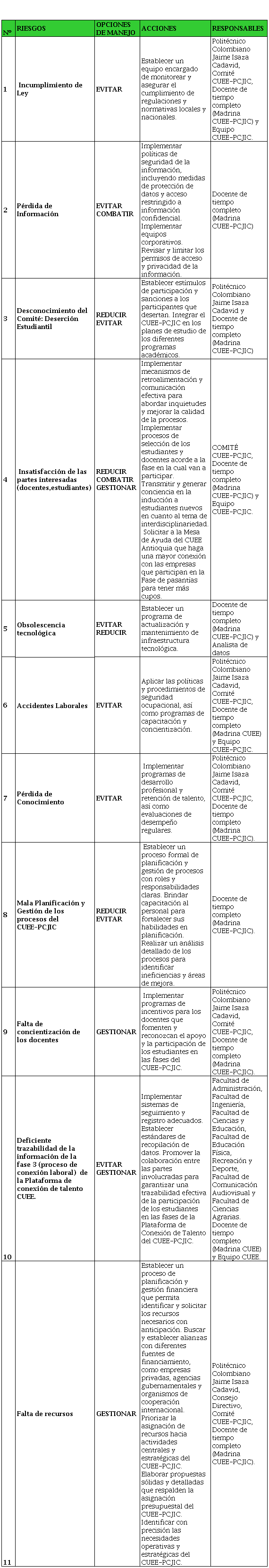 El análisis de estos riesgos revela una red compleja de factores. La mejora de procesos y la implementación de controles específicos son esenciales. La colaboración interdisciplinaria y la involucración constante de los miembros del CUEE-PCJIC son cruciales para anticipar y mitigar riesgos. En cuanto a las recomendaciones que se realizan para generar mejoras y minimizar el impacto de los riesgos identificados se encuentra el desarrollo de sistemas de gestión de datos avanzados, planificación de contingencias y sistemas de respaldo robustos, actualización constante de infraestructura tecnológica y estrategias proactivas para abordar la satisfacción y la participación estudiantil y docente. De esta manera el CUEE-PCJIC debe adoptar una mentalidad proactiva hacia la gestión de riesgos, fomentando una cultura de evaluación continua. Además, se sugiere la creación de un equipo dedicado a la identificación y gestión de riesgos y la implementación de un sistema de alerta temprana. Este análisis integral proporciona una base sólida para mejorar la eficacia del CUEE-PCJIC, asegurando su contribución continua a los planes institucionales de mejoramiento y autoevaluación, al desarrollo socioeconómico y la colaboración universidad-empresa-Estado.