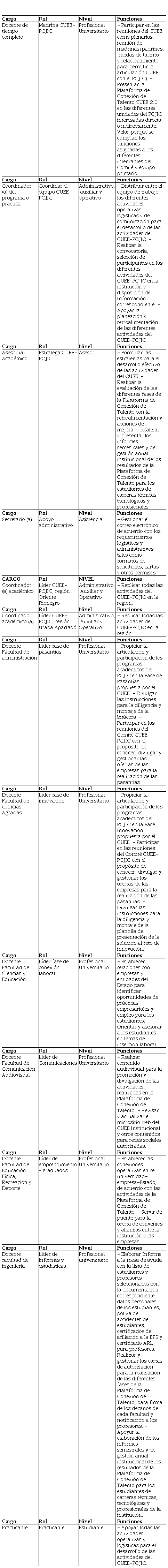 Adicionalmente, se encuentra pertinente la consideración de los roles que se registran en la tabla 5, en consideración de las necesidades de gestión del CUEE y de las oportunidades que desde el mismo se pueden gestionar para la comunidad académica del PCJIC.