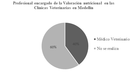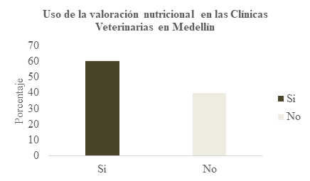 El estudio fue realizado en una población de 135 clínicas veterinarias legalmente constituidas, de las cuáles se obtuvo una muestra de 75 clínicas, que fueron encuestadas. Según las encuestas realizadas, el 60 % de las clínicas veterinarias de Medellín no realizan ninguna valoración nutricional, mientras que el 40 % de las clínicas veterinarias si lo hace (Ver gráfico 1).