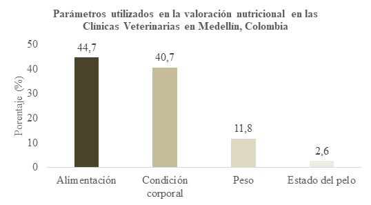 Abstract: Animal nutrition allows the proper functioning of the body and is a basic pillar for maintaining body homeostasis. The objective of the study was to determine the percentage of veterinary clinics in Medellín that carry out nutritional evaluation in their consultations, the parameters used to carry it out and identify the main diseases of nutritional origin in canines and felines. 72 veterinary clinics in Medellín were surveyed. 60% of veterinary clinics do not carry out nutritional evaluation and use parameters such as body condition (40.7%), diet (44.7%), weight (11.8%) and hair condition (2.6%). The indices used to perform it were ICM (5.1%), ICC (37.1%), BMI (5.1%). 43.6% of the dogs and cats that come for consultation each month are due to nutritional problems, the most frequent being gastroenteric and dermatological. It is necessary to implement formats for nutritional evaluation in dogs and cats.