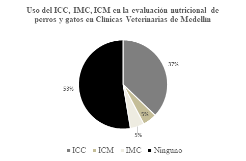 La nutrición está definida como el proceso de proporcionar y obteniendo los alimentos necesarios para el crecimiento y la salud del animal, y permite la realización de tres procesos fundamentales; mantenimiento de las condiciones internas, desarrollo, movimiento y equilibrio homeostático del organismo a nivel molecular y microscópico [8]. La nutrición animal se dedica al estudio de la alimentación de los animales, normalmente para su cría y uso humano, aunque también se utiliza para recuperar animales salvajes protegidos, dicha función se ha realizado tradicionalmente por los zootecnistas, pero ellos no se encuentran en contacto con los pacientes, por lo que no puede realizarse un seguimiento adecuado del funcionamiento de estas dietas. Actualmente, se recomienda que adicionalmente al examen médico (temperatura, pulso respiración y evaluación del dolor) se realice una valoración nutricional del animal [9], lo que permitiría evaluar de forma más integral el animal. Sin embargo, no se encuentran reportes en la literatura si las clínicas veterinarias realizan evaluaciones nutricionales para los animales de compañía y se recomienda que la iniciación a la formalización de este abordaje se realice cuanto antes a nivel mundial, ya que la evaluación nutricional debe ser realizada como parte del examen físico del animal [10]. Este estudio, tiene como objetivo determinar el porcentaje de clínicas veterinarias de Medellín que realizan la valoración nutricional en sus consultas, los parámetros utilizados para realizarla y reportar los principales diagnósticos de enfermedades de origen nutricional en caninos y, felinos reportados por las clínicas veterinarias en este estudio.