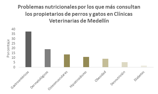 Las enfermedades que se presentan en mayor porcentaje en perros y gatos son gastroentéricas, obesidad desnutrición, diabetes, hipotiroidismo, problemas osteomusculares cálculos renales, problemas dermatológicos. Estas patologías nutricionales pueden ser solucionadas realizando correcciones y ajustes en la dieta de los animales, a través de nuevos diseños dietarios, exclusión o inclusión de alimentos y nutrientes.
