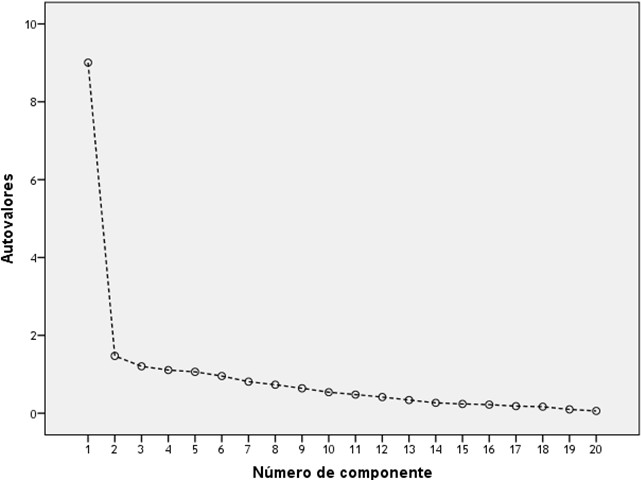 El primer autovalor explica más del 30 % y el segundo menos del 10 %, de donde se puede afirmar el cumplimiento del criterio de unidimensionalidad citado en Céspedes, Cortés y Madrigal (2011) y Jiménez y Montero (2013).