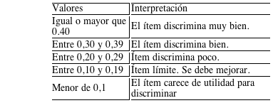 Como no existe unicidad de criterio acerca del valor adecuado de un ”índice de discriminación“ a partir del cual se pueda considerar como de buena discriminación, en la investigación se aplicaron los rangos de baremación de Lozano y De la Fuente (2013), que se presentan en la Tabla1.1.