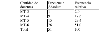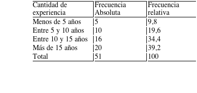 La muestra estuvo integrada por 26 hombres y 25 mujeres. Su distribución según la categoría profesional y por antigüedad en el ejercicio de la profesión, se presentan en las Tablas1.2 y 1.3, respectivamente: