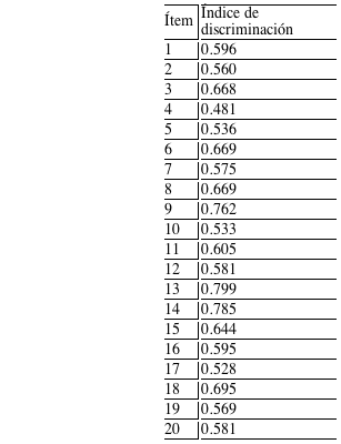 En la Tabla1.5 se observa que todos los índices de discriminación alcanzan niveles para interpretar que discriminan muy bien, según lo estipulado por Lozano y De la Fuente (2013, p.12). Para el resto de los cálculos solo se utilizaron estos 20 ítems. El valor del Alfa de Cronbach para los 20 ítems retenidos fue de 0.932; lo que indica que el instrumento muestra una excelente confiabilidad, de acuerdo con el criterio de Cea (1999).