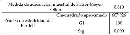La razonabilidad del uso del análisis factorial se determinó con la medida de adecuación muestral KMO (Kasier-Meyer-Olkin) y la prueba de esfericidad de Barlett. Para la interpretación del coeficiente KMO se aplicaron las recomendaciones de Kasier (1974), citadas por Frías-Navarro y Pascual (2012), a saber: