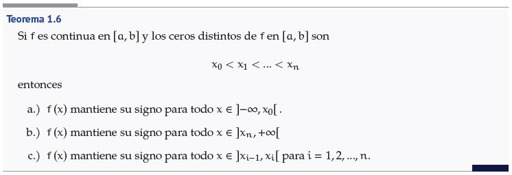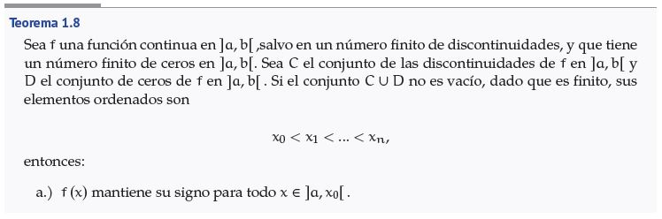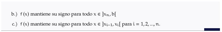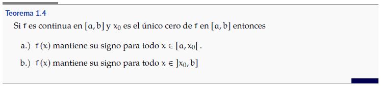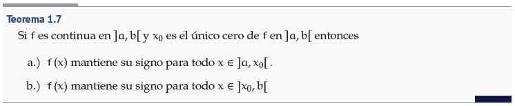 Prueba. Para a.), suponga por contradicción que existen , ∈ con tales que y tienen signos distintos. Como , ∈ , entonces es continua en y por el TVI se tiene que existe ∈ con . Como ∈ , entonces . Así, , lo cual contradice la hipótesis de que es el único cero de en . ■