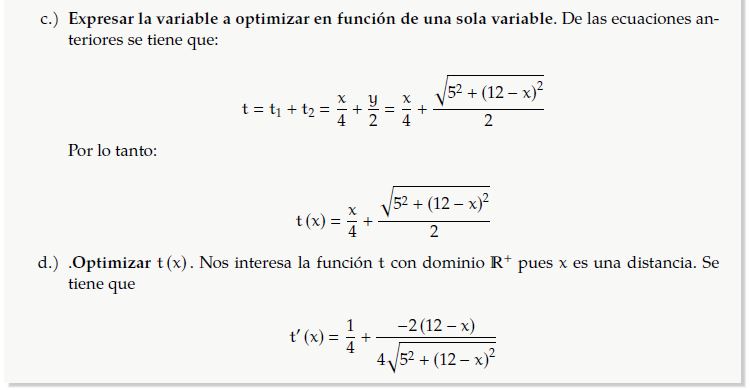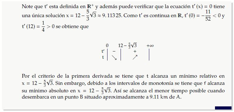 El problema anterior, se puede abordar restringiendo más el dominio de a un intervalo cerrado , y bastaba hallar el mínimo absoluto de en un intervalo cerrado. Sin embargo, la solución brindada, da un camino diferente.