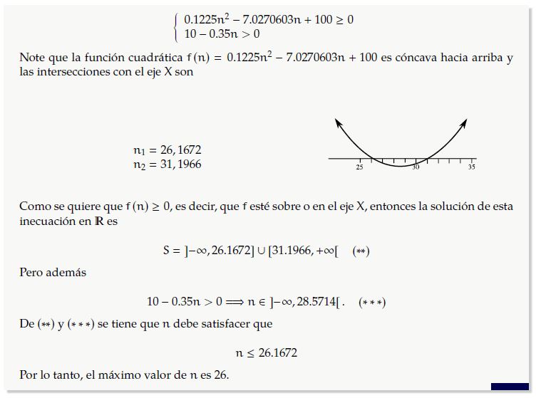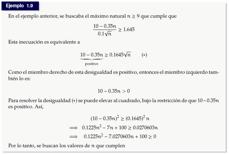 También en probabilidad se suelen presentar inecuaciones no tan fáciles de resolver. El siguiente ejemplo fue tomado de Sanabria (2012) y la inecuación que involucra es resuelta utilizando el método analítico.