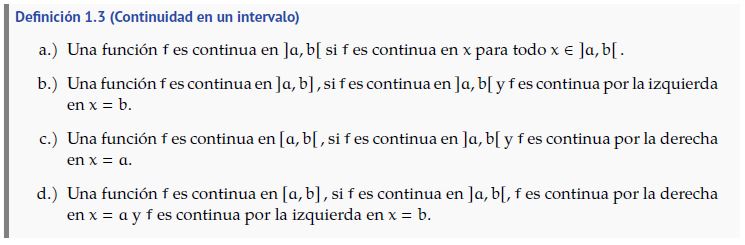 Seguidamente se presentan los principales resultados y definiciones presentes en la Teoría de Continuidad de funciones. Estos resultados y otros se encuentran en Apostol (1986) y Stewart (2001).