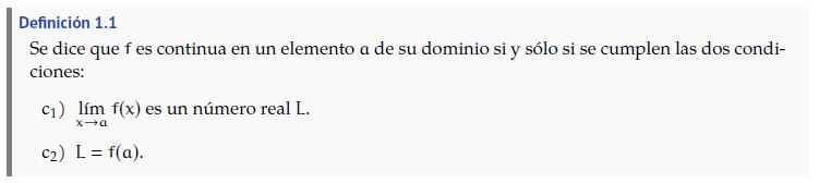 Sean la colección de todos los subconjuntos de de los cuales es un elemento, o sea , y la colección de todas las funciones reales de variable real definidas en , . Notemos que es la extensión del concepto de partida de la Definición 1. El contenido del concepto de función continua en un elemento de es el conjunto formado por las propiedades y . La extensión de este concepto, que indicamos por , es la colección de elementos de que satisfacen las propiedades del contenido. El concepto de continuidad en el punto se indica por y cuando no dé lugar a confusión utilizaremos .