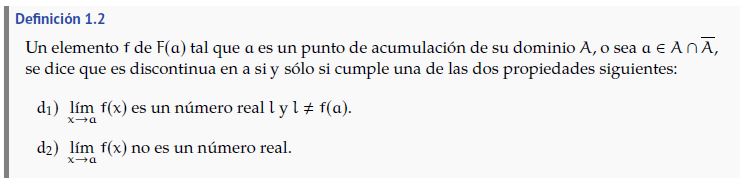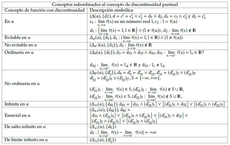 El contenido del concepto de función discontinua en un punto de acumulación a de su dominio es el conjunto . La extensión de este concepto, que denotamos por , es la colección de los elementos de que pertenecen a , donde , y que satisfacen la propiedad del contenido.