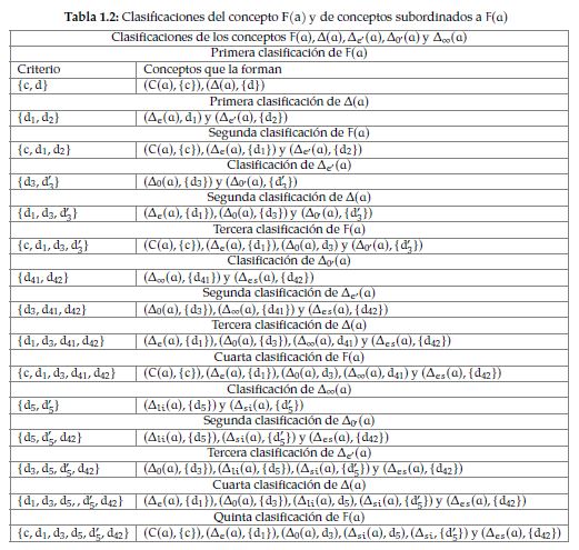 Utilizando los resultados de la clasificación realizada en la Sección1.4 y en este epígrafe se puede clasificar el concepto F(a) en los conceptos C(a), D.(a), D.(a), D.(a)yDes(a). Procediendo de forma similar se pueden construir otras clasificaciones de los conceptos D.j (a) y D.j .