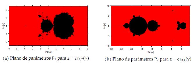 El plano de parámetros se genera partiendo con un punto crítico independiente como valor inicial para el operador y se aplica el método iterativo MA1 para todos los valores del parámetro definidos en una malla sobre el plano complejo. Si en un punto, donde es un valor específico, el método converge en menos de 50 iteraciones a alguna de las raíces del polinomio o entonces a dicho punto se le asigna el color rojo; en otro caso entonces al punto se le asigna el color negro.