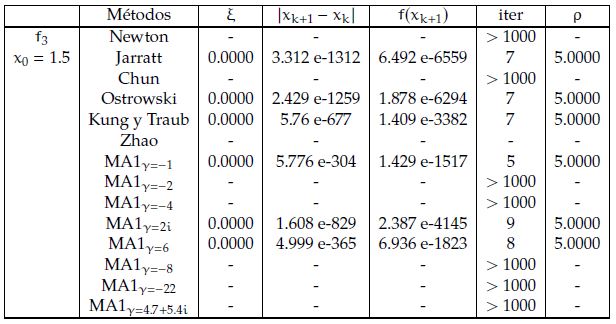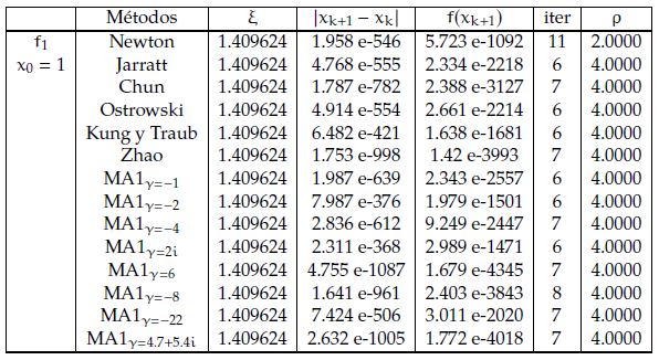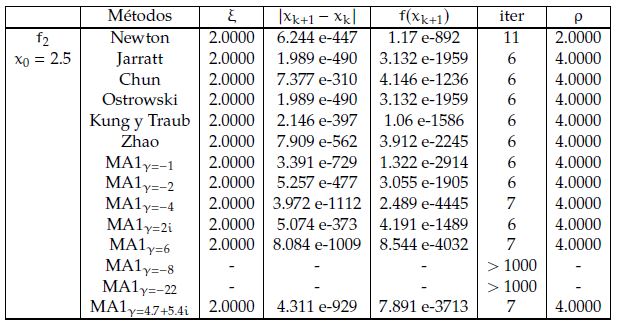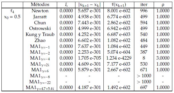 Algo particular es que en la Tabla 4, la gran mayoría de métodos convergen lentamente: esto se sabe ya que su ACOC es igual a 1, en otros casos el método diverge; esto es esperable ya que la función posee ceros con multiplicidad lo cual genera problemas para los métodos iterativos usuales. Sin embargo, el método MA1 cuando realizó un número considerablemente menor de iteraciones a los demás, con un orden de convergencia mayor.